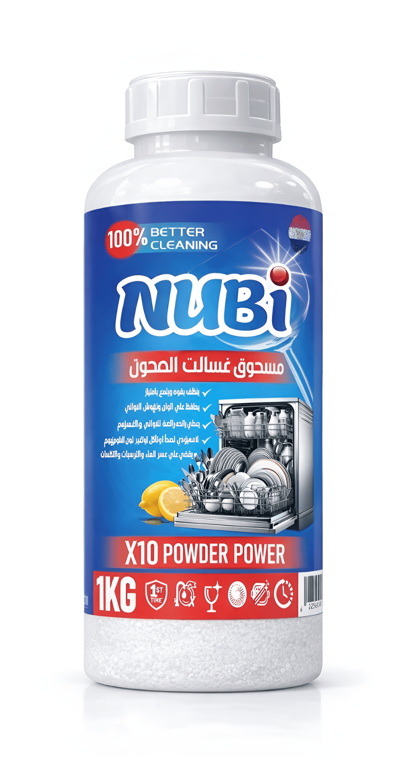 Concentrated dishwasher cleaning powder with lemon fragrance.